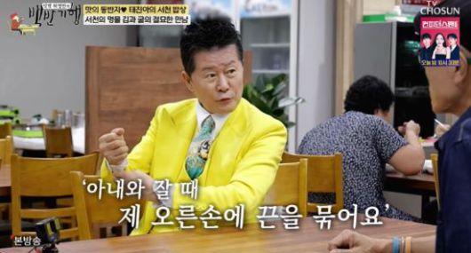 또 태진아가 아내의 손과 자신의 손을 끈으로 묶었던 사연도 공개됐다. 태진아는 "아내가 한 번은 일어나서 화장실을 가다가 넘어져서 팔이 골절돼 다쳤다. 미안하더라. 그 다음부터는 아내와 잘 때 제 오른손에 끈을 묶어서 아내가 일어나면 제가 잠에서 깨게 해놨다"라고 털어놨다.