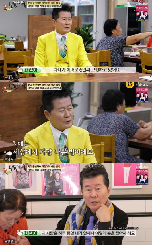 식당을 찾은 음식이 나오기 전 대화를 나눴다. 허영만이 태진아에게 "사모님이 오랫동안 아프셨다고 들었다"라고 하자, 태진아는 "아내가 치매로 6년째 고생하고 있다"고 털어놔 안타까움을 자아냈다. 이어 "치매는 세상에서 가장 나쁜 병이다"라고 덧붙였다.