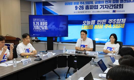 김형선 금융노조 위원장은 16일 열린 총파업 결의 대회 기자회견에서 “주 4.5일제는 단순히 노동시간을 줄이는 제도가 아니라 모든 노동자에게 재충전의 시간을 보장하고, 여성 노동자의 경력 단절을 막을 수 있다”며 “반드시 주 4.5일제를 쟁취하겠다”고 강조했다.