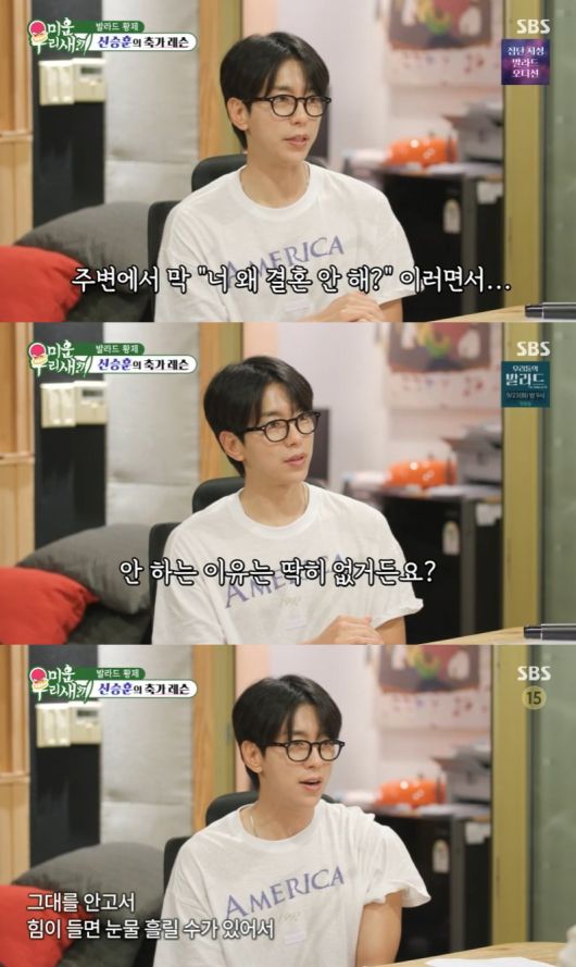 그러자 신승훈은 "'신승훈이 축가를 부르면 잘 산다'는 소문이 있다. 진짜 다 잘 살고 있다 나만 이러고 (미혼) 이다"라고 토로해 웃음을 자아냈다.