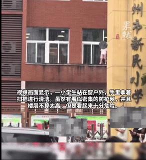 19일 중국 관찰자망 보도에 따르면 최근 중국 소셜미디어에는 쓰촨성 루저우시의 신민초등학교에서 한 학생이 교실 창틀 밖으로 나가 빗자루로 외부를 청소하는 모습이 담긴 영상이 확산됐다.