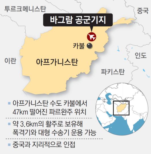 바그람 공군기지는 아프간 수도 카불에서 북쪽으로 47km 떨어진 곳에 있다. 2001년 9·11테러 직후 미국은 이 테러를 기획한 오사마 빈라덴 알카에다 지도자가 아프간을 통치하는 수니파 극단주의 무장세력 탈레반의 보호 아래 은신 중이란 점을 파악한 뒤 아프간을 공격했다. 미군이 2021년 아프간에서 철수할 때까지 이곳을 중심으로 아프간에서 군사 작전을 펼쳐 왔다. 한때는 미군 10만 명이 상주할 정도로 아프간 내 핵심 거점이었다.