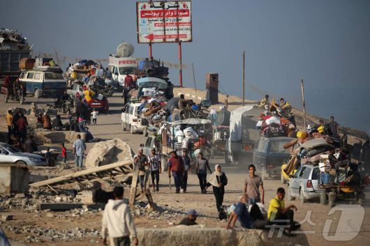 이스라엘이 가자지구에 대피 명령을 내리자 18일(현지시간) 팔레스타인인이 중부 누세이라트 난민 캠프에서 남쪽으로 이동하고 있다. 2025.9.18 ⓒ AFP=뉴스1 |