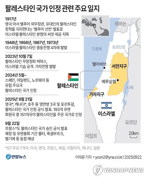 22일에는 G7 일원인 프랑스도 팔레스타인 국가 승인을 공식 발표할 예정이며, 뉴욕에서 열리는 유엔총회 기간 몰타, 룩셈부르크, 벨기에 등도 동참할 것으로 예상된다.