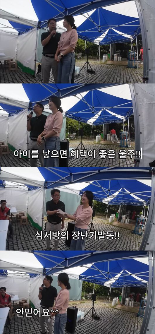 그러자 심현섭은 "솔직하게 이야기해라. 왜 울주에 이사오고 싶은지 마음에 있는 이야기를 해라"고 다시 물었다. 정영림이 대답을 망설이자, 심현섭은 "(울주군이) 아이를 낳으면 혜택이 좋다더라"고 대신 말해 웃음을 자아냈다.