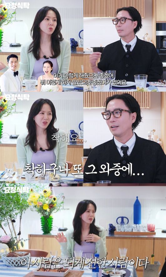 그러면서도 손예진은 “다행히 너무 감사한 게 실제로 부부들이 그런 걸로 싸운다더라. 다행히 우리 신랑은 속으로 섭섭한지 모르겠지만 겉으로 티를 안 내고 당연하게 받아들여준다”고 말했다. 이어 “우리 신랑의 가장 큰 장점이 나한테 ‘이거 이렇게 해줬으면 좋겠어’, ‘이렇게 하지 말았으면 좋겠어’ 하는 게 없다. 착하다”라고도 자랑했다.