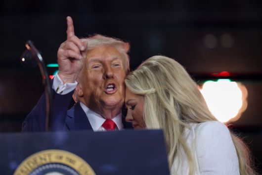 도널드 트럼프 미국 대통령이 21일(현지시간) 미국 애리조나주 글렌데일의 스테이트 팜 경기장에서 열린 보수 성향 찰리 커크의 추모식에서 무대 위로 손가락을 가리키고 있다. /AFP 연합 |