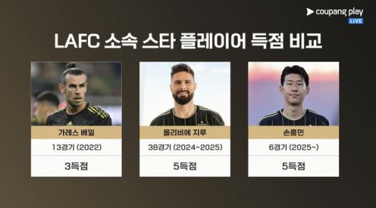 경기를 앞두고 LAFC-솔트레이크 경기를 중계하는 '쿠팡 플레이'는 LAFC 출신 스타 플레이어들의 득점 기록을 조명했다. 손흥민보다 앞서 LAFC에 입성했던 가레스 베일, 올리비에 지루가 있었다. 베일은 2022년 13경기 3골에 그쳤고 지루도 2024년부터 2025년까지 38경기 5골에 불과했다.