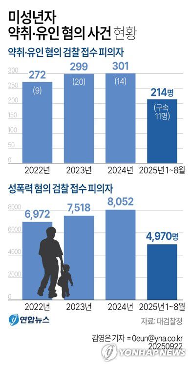 미성년자 대상 성폭력 혐의로 검찰에 접수된 인원도 2022년 6천972명, 2023년 7천518명, 2024년 8천52명, 올해(1∼8월) 4천970명으로 증가 추세다.