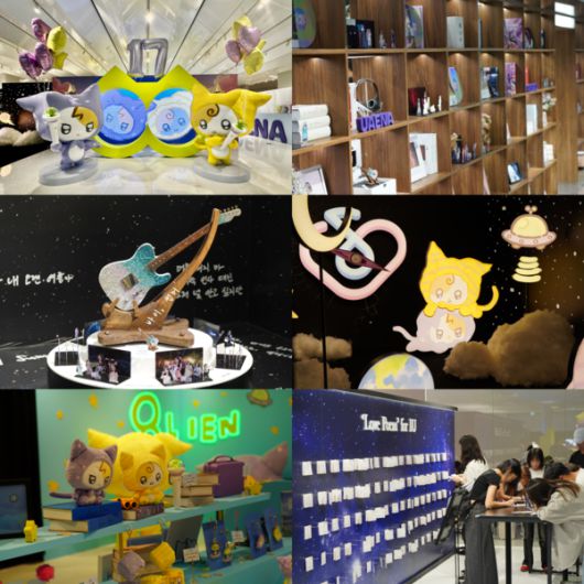 '메인 포토존'에는 '에일이언' 조형물과 숫자 8을 형상화한 오브제가 설치돼 애니메이션을 감상할 수 있었고, '우리의 세계 존'은 아이유와 팬들의 연결을 우주적 감각으로 풀어냈다. 역대 앨범 커버와 소품이 전시된 '인피니티 서재 존', 지난해 콘서트에서 사용한 기타와 손글씨 가사가 전시된 '바이, 썸머 존' 등도 팬들의 눈길을 끌었다.