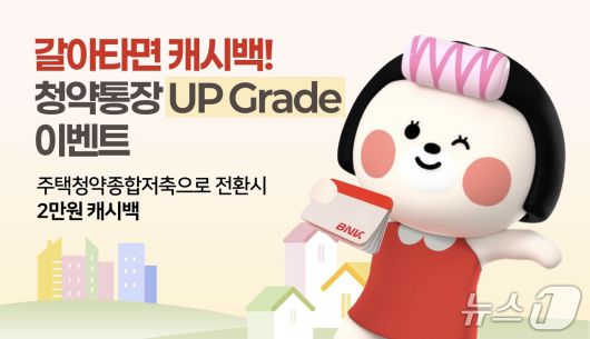 (부산=뉴스1) 윤일지 기자 = BNK부산은행은 12월 15일까지 주택청약예금·부금을 주택청약종합저축으로 전환하는 고객을 대상으로 캐시백 혜택을 제공하는 '갈아타면 캐시백! 청약통장 UP-grade 이벤트'를 실시한다고 22일 밝혔다.
