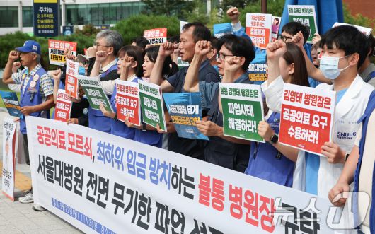 (서울=뉴스1) 허경 기자 = 공공운수노조 의료연대 서울대병원분회 조합원들이 22일 서울 종로구 서울대병원 본관 앞에서 열린 무기한 파업 선포 기자회견에서 공공의료 수용을 촉구하는 구호를 외치고 있다. 2025.9.22/뉴스1neohk@news1.krCopyright ⓒ 뉴스1. All rights reserved. 무단 전재 및 재배포, AI학습 이용 금지.