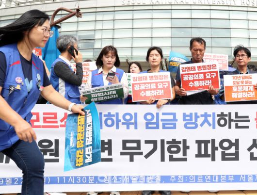 [이데일리 김태형 기자] 민주노총 의료연대본부 서울대병원분회 노조원 등이 22일 서울 종로구 서울대병원 본관 앞에서 기자회견을 하고 있다.