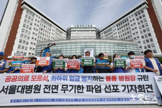 22일 서울 종로구 서울대학교병원 본관 앞에서 서울대병원 무기한 파업 선포 기자회견이 열리고 있다.
