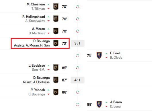 어시스트 선수가 모란과 손흥민, 2명으로 기록된다. 출처 | MLS 공식 홈페이지 |