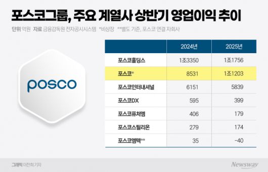 업계 불황 속 철강 자회사 포스코는 올해 실적 버팀목 역할을 했다. 포스코홀딩스를 포함한 그룹 상장사 6곳(포스코홀딩스·포스코인터내셔널·포스코퓨처엠·포스코DX·포스코스틸리온·포스코엠텍)은 모두 영업이익이 작년 동기보다 악화된 가운데 포스코는 유일하게 성장했다.