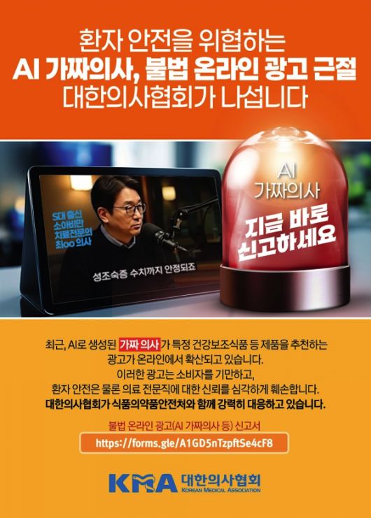 대한의사협회는 22일 산하단체에 ‘불법 온라인 광고 신고’ 안내를 전달하고 회원들을 대상으로 적극적인 신고와 홍보를 요청했다. 의협은 "최근 AI로 생성된 가짜 의사가 특정 건강보조식품 등 제품을 추천하는 광고가 확산되고 있다, 이러한 광고는 소비자를 기만하고 환자 안전은 물론 의료 전문직에 대한 신뢰를 심각하게 훼손하는 행위"라고 지적했다.