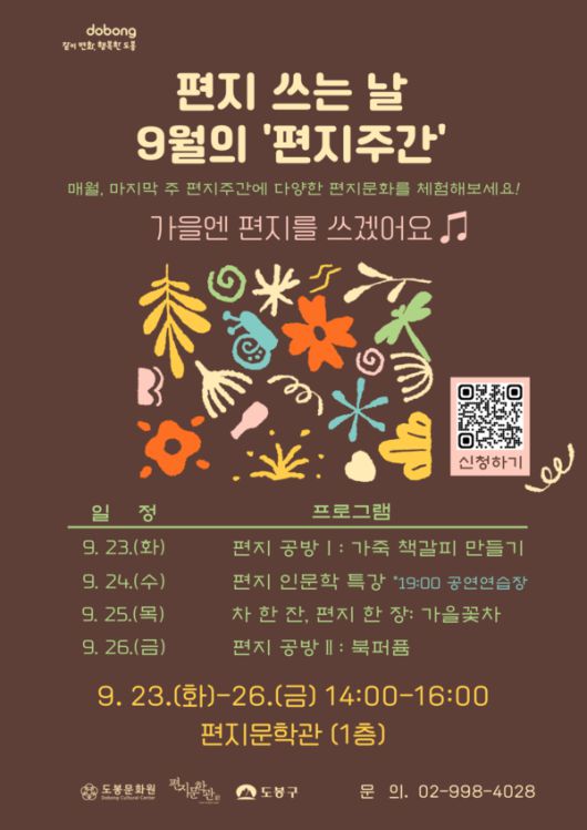 9월 23(화) 편지공방Ⅰ: 가죽 책갈피 만들기(공방 '짜임' 이현애 대표), 9월 25일(목) 차 한 잔, 편지 한 장: 가을 꽃차(메리골드) 마시기 9월 26일(금) 편지공방Ⅱ: 나만의 북퍼퓸 만들기(공방 '오떼르 바이루리' 이문정 대표) 등 프로그램은 누구나 무료로 참여할 수 있다.