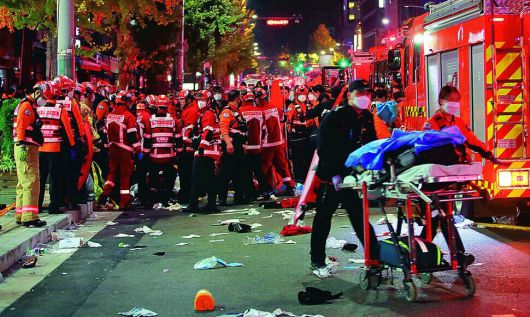 2022년 10월29일 밤 서울 용산 이태원 해밀턴 호텔 뒤 골목에서 참사가 발생했다. 사진은 2022년 10월30일 새벽 참사 수습 현장 모습. 박종식 기자 anaki@hani.co.kr |
