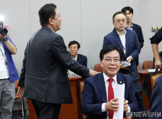 [서울=뉴스핌] 정일구 기자 = 국회 운영위원장인 김병기 더불어민주당 원내대표와 송언석 국민의힘 원내대표가 22일 오후 서울 여의도 국회에서 열린 국회운영위원회 전체회의가 산회한 뒤 동료 의원들과 대화하고 있다. 2025.09.22 mironj19@newspim.com