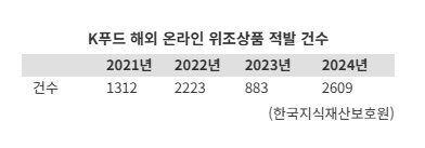 22일 특허청 산하 한국지식재산보호원에 따르면 식품분야의 해외 온라인 위조상품 유통차단 적발 건수는 2021년 1312건, 2022년 2223건, 2023년 883건에 이어 지난해 2609건으로 급증했다. 단속 강화 효과로 올들어서는 6월까지 250건으로 줄었지만 4년 반동안 적발건수가 7300건에 육박한다.