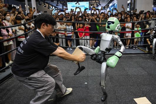 중국 상해에서 열린 세계 인공지능 컨퍼런스 도중 로봇이 송판을 깨고 있다. [AFP]