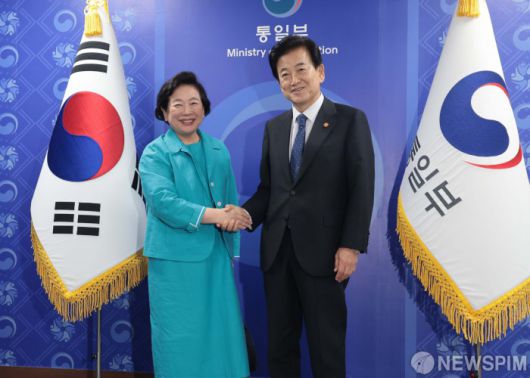 [서울=뉴스핌] 이길동 기자 = 정동영 통일부 장관이 22일 오후 서울 종로구 정부서울청사에서 현정은 현대그룹회장 면담에 앞서 악수하며 기념촬영을 하고있다. 2025.09.22 gdlee@newspim.com |