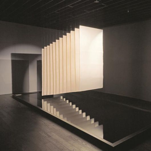 서울 강남구 신사동 호림박물관 신사분관에 전통 수묵화의 표현 양식을 해체하는 김호득의 '흔들림, 문득-공간을 그리다'가 설치된 모습. 먹물 위로 흰 한지를 여러 장 매단 작품으로, 한지가 흔들리며 움직이는 그림자를 통해 수묵이 품은 무한한 의미를 드러냈다. 호림박물관 제공 |