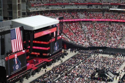 커크 추모식 - 21일(현지시간) 미국 애리조나주 글렌데일의 스테이트팜 경기장에서 열린 보수 청년 활동가 찰리 커크의 추모식에서 도널드 트럼프 대통령이 10만여명의 군중 앞에서 연설하고 있다. 글렌데일 AFP 연합뉴스 |