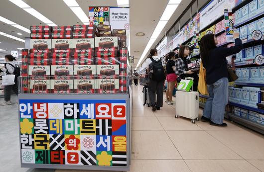 ‘K푸드’ 수출, 사상 최대 가시화 22일 서울 중구 롯데마트 서울역점에서 외국인 관광객들이 스낵과 쿠키, 브라우니 등 K푸드 상품을 고르고 있다. 농림축산식품부에 따르면 올 8월까지 농식품 누적 수출은 지난해보다 5.1% 늘어난 67억1500만달러로 사상 최대를 기록했다. 연합뉴스 |