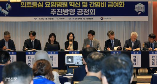 22일 서울 명동 로얄호텔서울에서 열린 ‘의료중심 요양병원 혁신 및 간병비 급여화’ 공청회에서 참석자들이 토론을 하고 있다. 서성일 선임기자 |