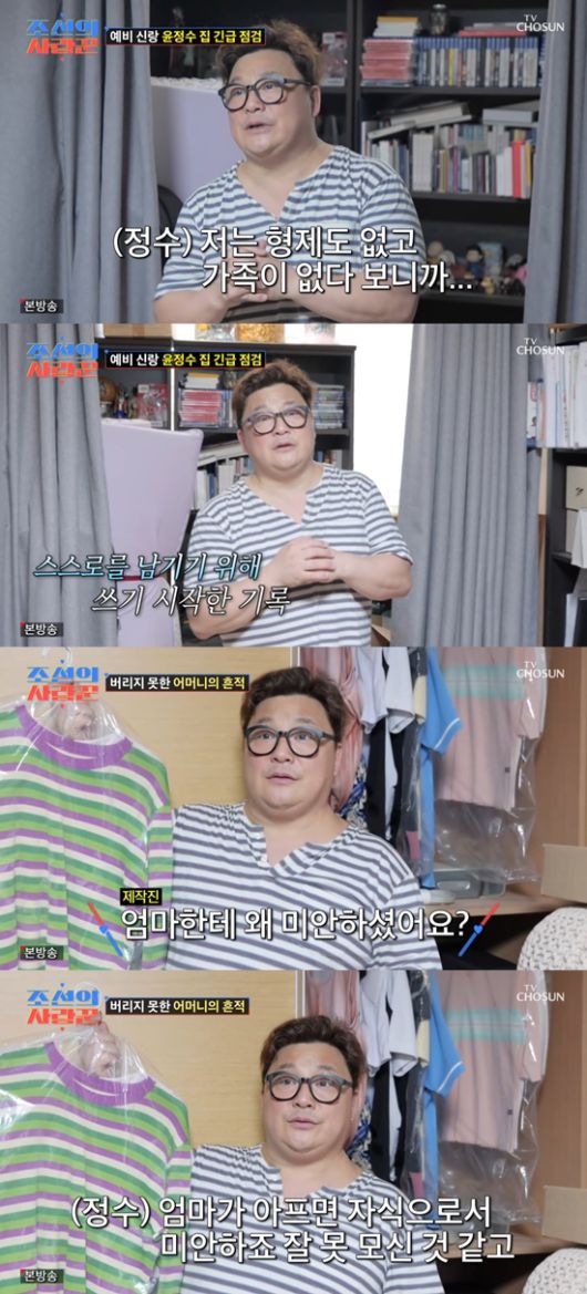 옷장 앞에 선 윤정수는 "이거는 저희 어머니가 입던 옷이다. 당연히 버릴 이유도 없지만 사실 매 해마다 제사 때마다 태우려고 했다. 엄마 정취가 묻어있고 엄마 냄새가 나는 것 같아서 태우면 안 되겠구나 싶어 잘 놔뒀다"라고 설명했다