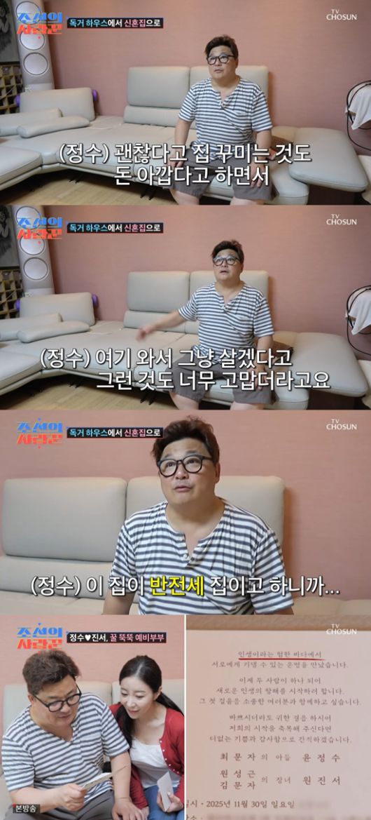 또 윤정수는 "(예비 신부가) 그냥 여기 와서 같이 살겠다고 했다. 반전세 집인데 너무 고마웠다"라고 설명했다. 예비 신부 원자현이 "청첩장 나왔다"라며 윤정수를 찾아왔다. 청첩장을 열어본 윤정수는 "잘했다"라며 원자현을 안아줬다. 이어 두 사람은 귀엽게 입맞춤하는 장면도 공개했다.