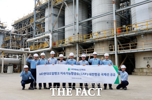 2027년부터 국내 공항에서 출발하는 모든 국제선 항공편에 지속가능항공유(SAF) 1% 혼합이 의무화되면서 정유업계가 SAF 시장 선점에 총력을 다하고 있다. HD현대오일뱅크 관계자들이 22일 HD현대오일뱅크 SAF를 생산하는 수첨분해공정에서 대한항공 국제선 SAF 공급 기념 촬영을 하고 있다. /HD현대오일뱅크 |