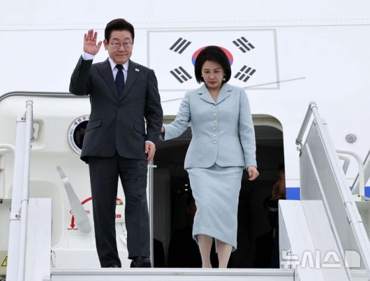 [뉴욕=뉴시스] 최동준 기자 = 유엔 총회에 참석하는 이재명 대통령이 22일(현지 시간) 미국 뉴욕 JFK 국제공항에 도착해 김혜경 여사와 공군 1호기에서 내리고 있다. 2025.09.23. photocdj@newsis.com