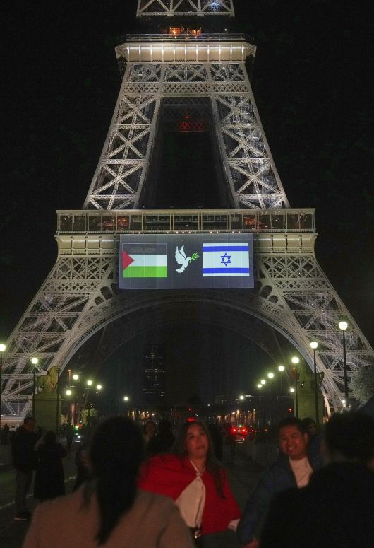 에펠탑에 이-팔 국기 나란히 21일 프랑스 파리 에펠탑에 설치된 대형 전광판에 팔레스타인(왼쪽)과 이스라엘 국기가 평화를 상징하는 비둘기 문양과 나란히 등장했다. 이날 영국, 캐나다, 호주, 포르투갈 등 4개국은 팔레스타인을 공식 국가로 인정했고 프랑스 또한 동참하기로 했다. 파리=AP 뉴시스 |