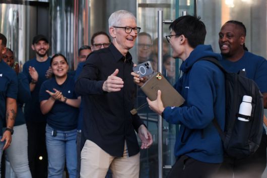 팀 쿡(앞 줄 왼쪽) 애플 최고경영자(CEO)가 아이폰17이 출시된 19일(현지시간) 미국 뉴욕 애플스토어에서 고객을 맞이하고 있다. 로이터 연합 |