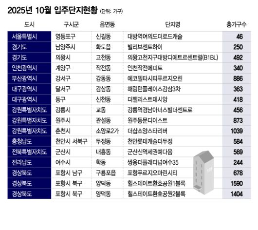 반대로 지방 입주물량은 증가했다. 10월 예정된 지방 입주물량은 9104가구로 전월(5521가구)보다 65% 늘어났다. 특히 경북(3672가구) 강원(2368가구)에서 1000가구 이상 대단지 입주가 예정되면서 두 지역의 입주물량이 지방 전체의 절반 이상을 차지했다. 이외에도 부산(886가구) 대구(781가구) 충남(584가구) 전북(569가구) 등지에서 입주가 진행된다.