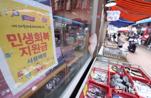 [서울=뉴시스] 김진아 기자 = 소득 상위 10%를 제외한 국민 90%에게 1인당 10만원을 추가 지급하는 2차 '민생회복 소비쿠폰' 신청과 지급이 시작된 지난 22일 서울의 한 전통시장에 민생 회복 지원금 사용가능 안내문이 붙어 있다. 2025.09.22. bluesoda@newsis.com |