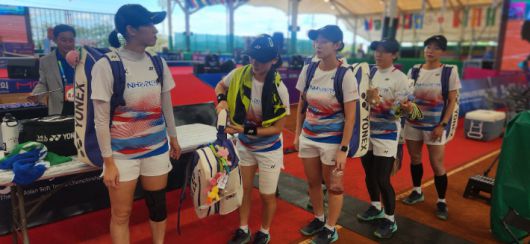한국 소프트테니스 여자 대표팀이 21일 제9회 문경아시아소프트테니스선수권대회 단체전 결승에서 일본에 아쉽게 우승컵을 내준 뒤 경기장을 빠져나가는 모습. 대회 조직위원회 |