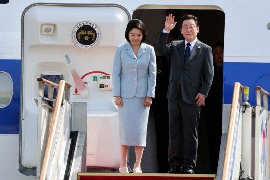 李대통령 부부 유엔 총회 참석차 출국 - 유엔 총회 참석을 위해 미국 뉴욕으로 출국하는 이재명 대통령과 부인 김혜경 여사가 22일 경기 성남시 서울공항에서 공군1호기에 탑승하기 전 인사를 하고 있다. 이 대통령은 3박 5일의 일정 동안 유엔 총회에서 기조연설을 하고 한국 정상으로서는 처음으로 유엔 안전보장이사회 공개 토의를 주재한다. 뉴스1 |