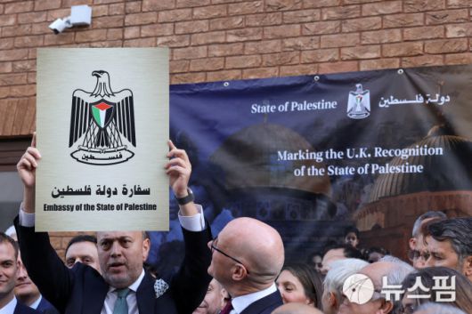 [런던 로이터=뉴스핌] 장일현 특파원 = 영국 주재 팔레스타인 대표부가 22일(현지시간) 영국 정부의 팔레스타인 국가 인정을 기념해 국기 게양식 행사를 개최했다. 팔레스타인 건물에 국기가 게양되는 것은 이번이 처음이다. 사진은 후삼 좀로트 주영 팔레스타인 대표가 '팔레스타인 국가 대사관'이라고 적힌 현판을 들어 보이며 "이곳에 설치될 것"이라고 말하는 장면이다. 그는 "팔레스타인은 존재한다. 언제나 존재했고 언제나 그럴 것"이라고 말했다. 이베트 쿠퍼 영국 외무장관도 BBC 방송과 인터뷰에서 "팔레스타인 자치정부(PA)는 (영국에) 대사관과 대사를 둘 수 있다"고 말했다. 2025.09.22. ihjang67@newspim.com |