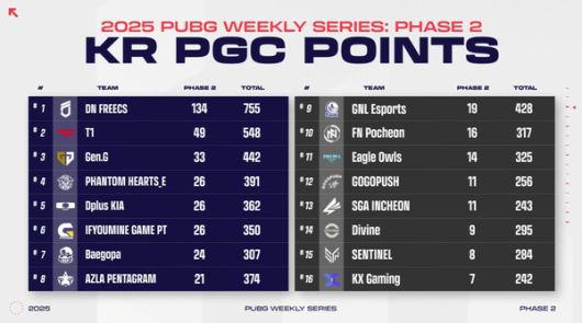 위클리 스테이지 종료 기준, '디펜딩 챔피언' DN 프릭스가 총 134점의 PGC 포인트를 획득하며 2위 T1(49점)을 트리플 스코어 수준의 격차로 따돌리고 있어 사실상 DN 프릭스의 우승이 확정적이다.