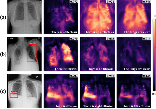 비전-언어 모델이 흉부 X-ray와 판독문의 관계를 학습해 유사도를 확률값으로 표현한 모습(사진=딥노이드) |