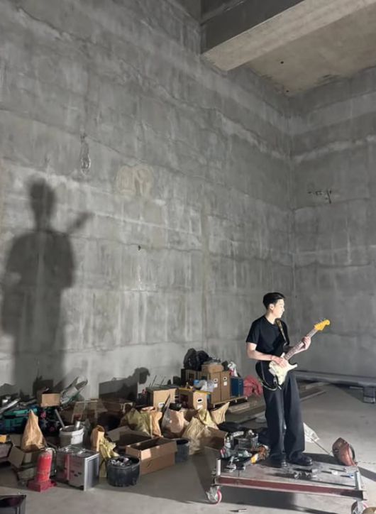공개된 사진 속 슈가는 여러 물건이 쌓여 있는 공간 한켠에서 기타를 연주하고 있다. 투블럭 헤어를 한 슈가는 상의부터 신발까지 올 블랙으로 맞췄다. 회색빛 콘크리트 벽에는 슈가의 그림자가 길게 드리워져 있다. 빛과 그림자의 대비가 신비롭운 분위기를 자아낸다.