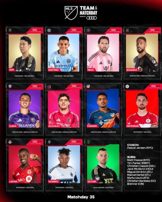 이번 주 베스트11은 3-4-3 포메이션으로 짜였다. 뉴욕시티FC의 파스칼 얀센 감독이 이끈 팀에 리치 라레이아(토론토FC), 조엘 워터먼(시카고 파이어), 에디에르 오캄포(밴쿠버 화이트캡스)가 수비진을 지켰고, 중원은 브렌든 맥소얼리(세인트루이스), 에반데르(FC신시내티), 마르틴 오헤다(올랜도 시티), 다비드 마르티네스(LAFC)가 채웠다. 공격 라인은 손흥민을 비롯해 드니 부앙가(LAFC) 메시로 MLS의 별들이 총출동한 조합이다.