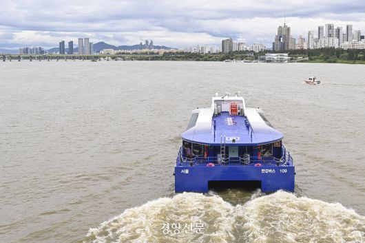 한강버스 정식운항 기념 시승식이 열린 지난 18일 서울 서초구 잠수교 인근에서 한강버스가 시범운행되고 있다. 한수빈 기자 |