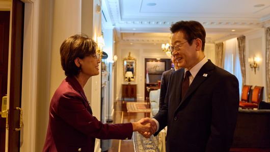 ▲ 유엔총회 참석차 미국을 방문한 이재명 대통령이 22일(현지시간) 뉴욕에서 영 킴 미 하원 외무위 동아태소위원장과 악수하고 있다.