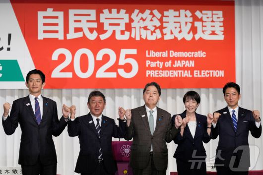 23일 일본 도쿄 자민당 본부에서 열린 자민당 총재 선거 후보 공동 기자회견에서 후보들이 포즈를 취하고 있다. 왼쪽부터 고바야시 다카유키 전 경제안보상, 모테기 도시미쓰 전 외무상, 하야시 요시마사 관방장관, 다카이치 사나에 전 경제안보상, 고이즈미 신지로 농림수산상. 2025.09.23. ⓒ 로이터=뉴스1 ⓒ News1 권준언 기자 |