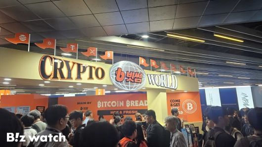 23일 그랜드 워커힐 서울에서 열린 KBW 2025를 둘러보던 수많은 참관객들이 홀린 듯 지하 2층에 위치한 주황색 부스로 끌려들어갔다. 놀이공원에 온 것처럼 화려하게 꾸민 입구에는 '크립토 월드(CRYPTO WORLD)'라는 문구가 적혀 있었고, 쉴새없이 구워지는 '비트코인 브레드(빵)'도 지나가는 사람들의 시선을 잡아끌었다.